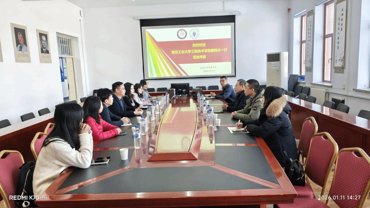 2026 年1月11日,我院接待了湖北工业大学工程技术学院副院长姜伟率队的来访调研团,成员包括院长助理兼管理系主任袁荃、经济系主任徐彬、管理系副主任梁晶、教务部副部长彭珊、经济系副主任王安顺及新道湖北分公...